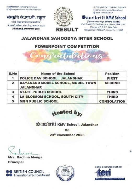 Result of Inter School Sahodaya Powerpoint Competition Hosted By Sanskriti KMV School 29-Nov-2025