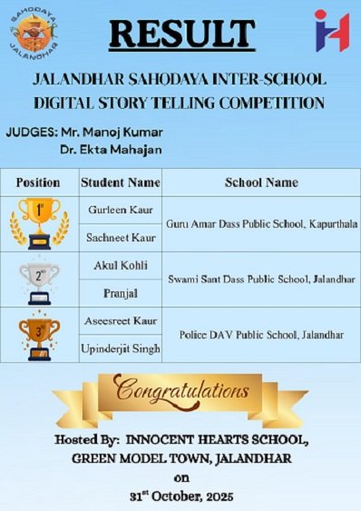 Result of Inter School Sahodaya Digital Story Telling Competition Hosted By Innocent Heart School, Green Model Town Jalandhar 31-Oct-2025