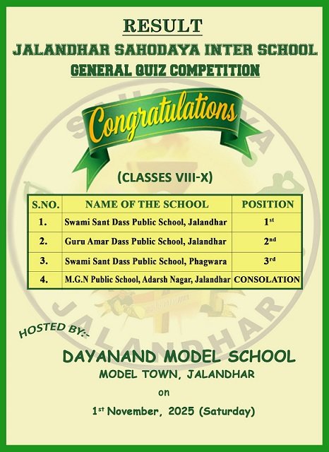 Result of Inter School Sahodaya General Quiz Competition Hosted By DMS, Model Town, Jalandhar 01-Nov-2025