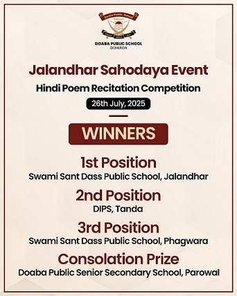 Result of Inter School Jalandhar Sahodaya Hindi Poem Recitation Competition Hosted By Doaba Public School, Dohlron 26-Jul-2025