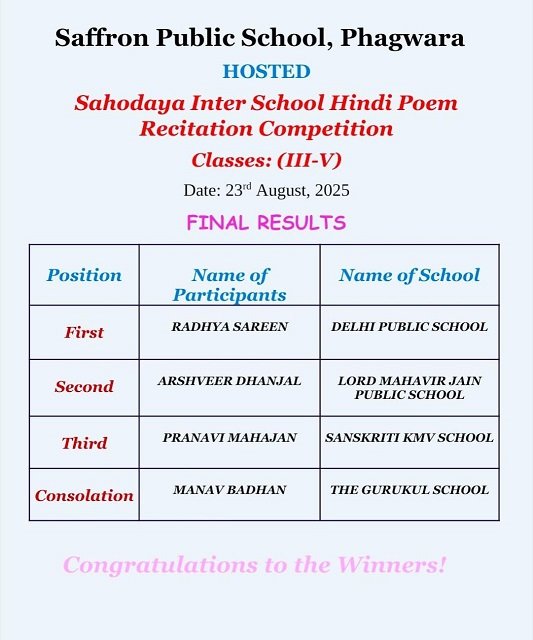 Result of Inter School Jalandhar Sahodaya Hindi Poem Competition Hosted Saffron Public School, Phagwara 23-Aug-2025