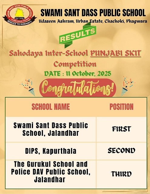 Result of Inter School Jalandhar Sahodaya Punjabi Skit Competition Hosted By Swami Sant Dass Public School Phagwara 10-Oct-2025