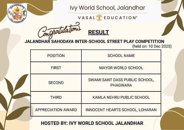 Result of Inter School Jalandhar Sahodaya Street Play Competition Hosted By IVY World School 10-Dec-2025